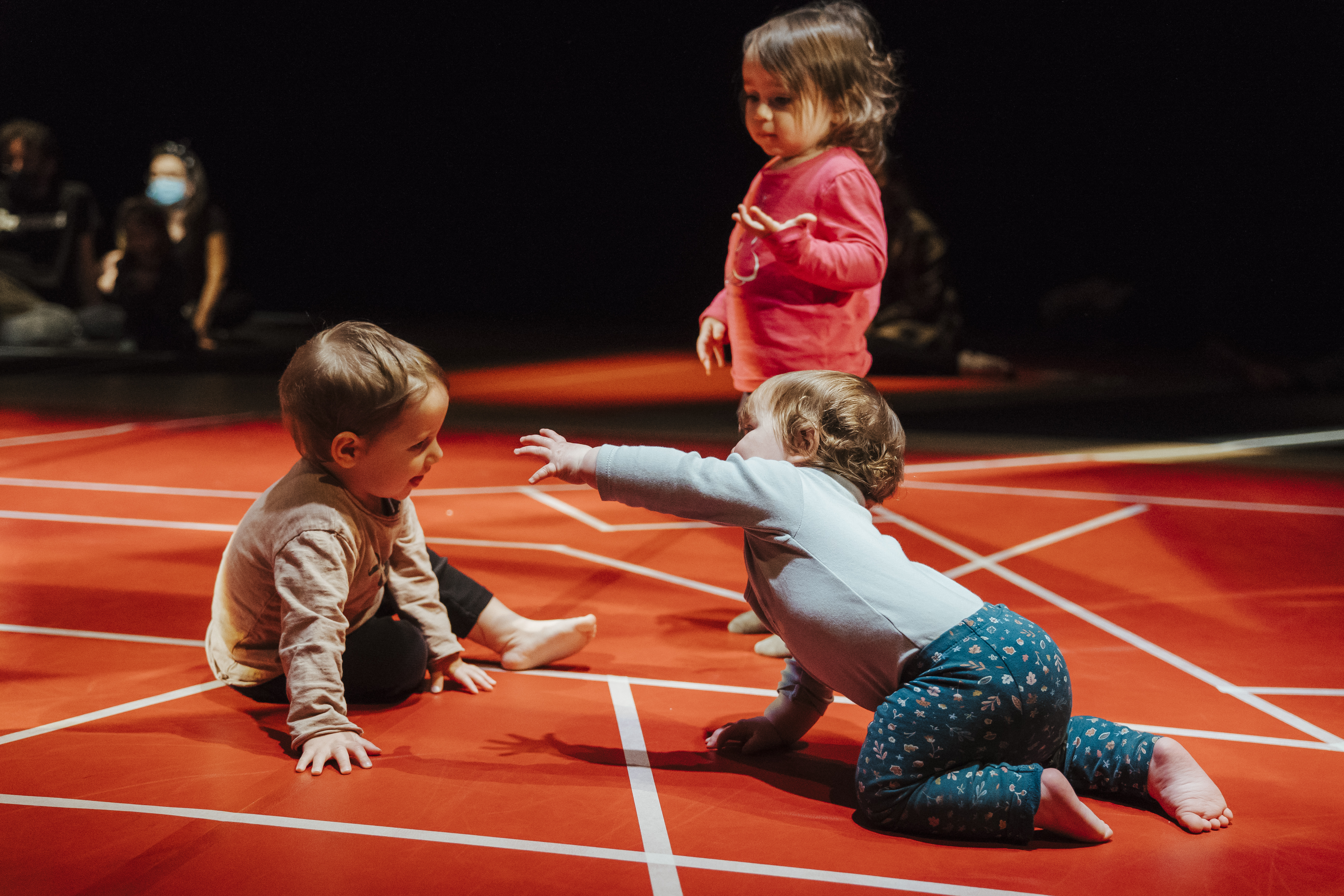 L’obra de Pablo Palazuelo inspira aquest espectacle participatiu per a famílies amb bebès de 0 a 3 anys. Una experiència artística oberta en què, a partir de la dansa contemporània i la música interpretada en directe, es convida els espectadors a formar part de la proposta activament. Un element senzill, la cinta de pintor, genera moments d’enorme bellesa quan es troba amb l’univers infinit del bebè, meravellat per la novetat i convidat per les intèrprets a l’exploració i el joc. Dos ballarines i un pianista dibuixen amb el cos i la música paisatges abstractes juganers, íntims, suggeridors...