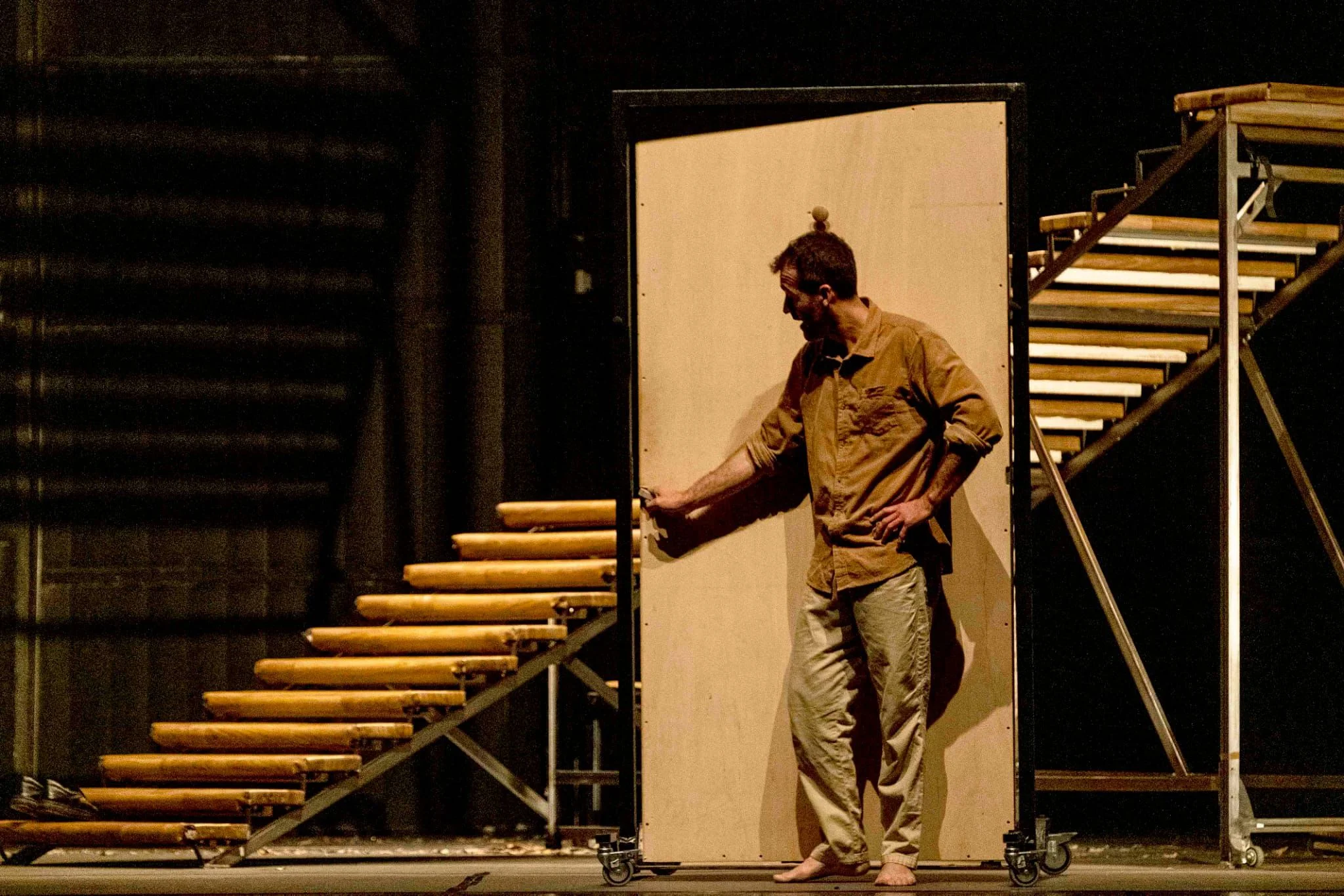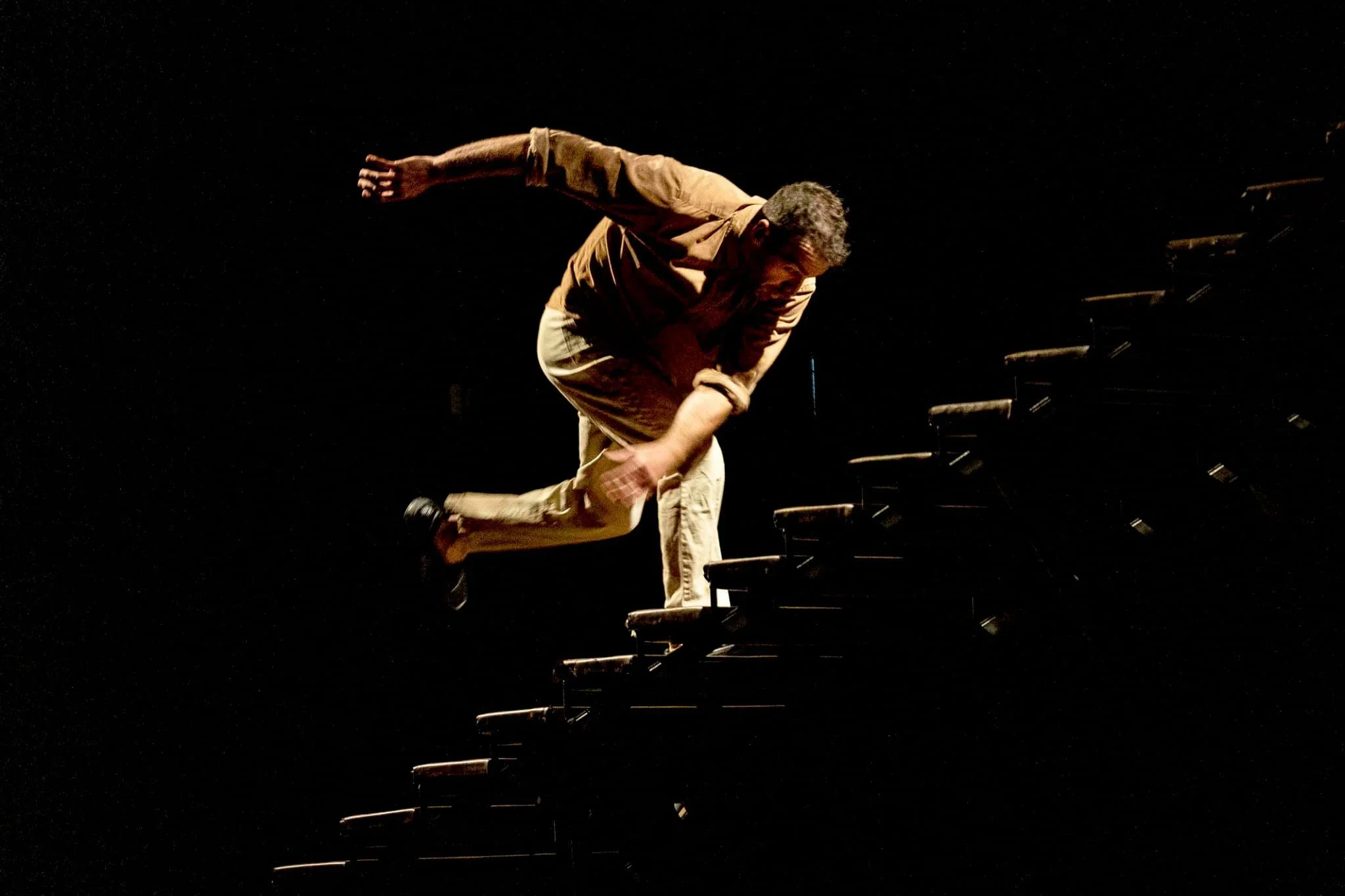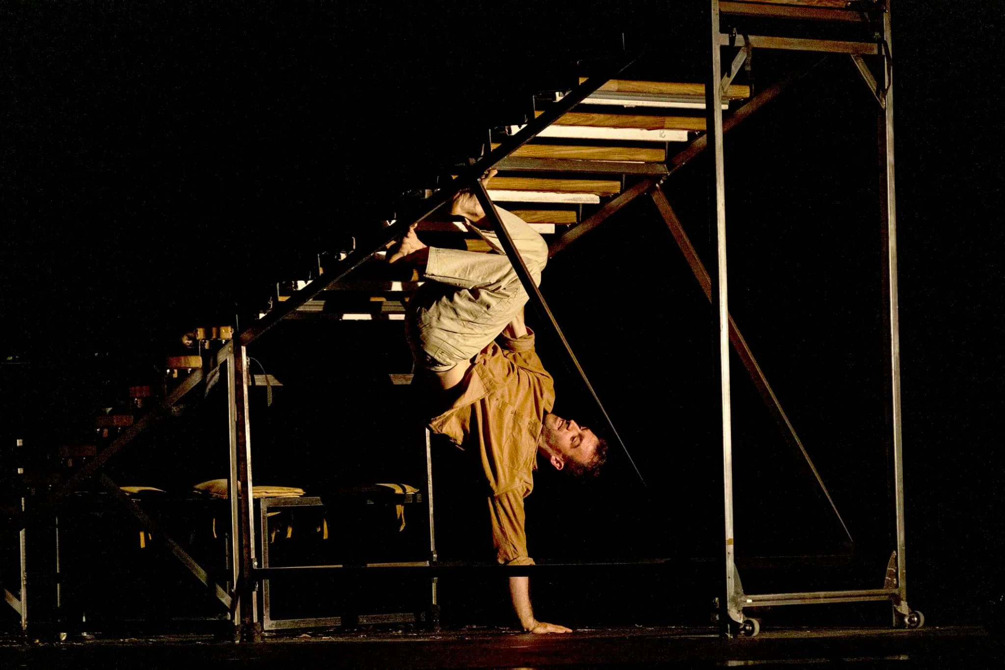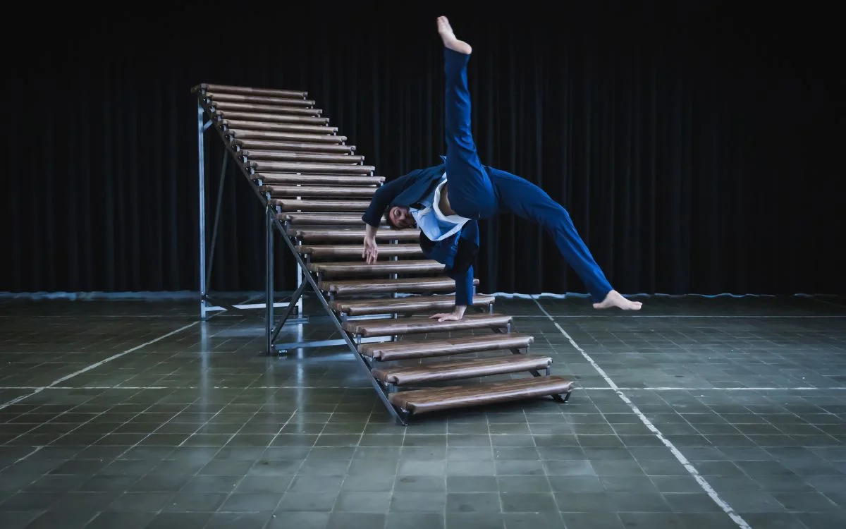 Akri és un solo de circ poètic i visceral que, a través de la relació entre un acròbata i una escala de 22 esglaons, reflexiona sobre els llindars vitals: aquells moments de canvi, de transició, en què tot trontolla. L’escala, alhora escenografia i aparell acrobàtic, esdevé el centre físic i simbòlic de l’obra. Representa el pas entre dues realitats, però també encarna l’ofici del circ, una manera de viure i entendre el cos, el risc i el temps. Com vivim el temps que passa entre dos moments? Com habitem aquests no-llocs que, com una escala, no estan pensats per ser habitats? Com passegem pel llindar?